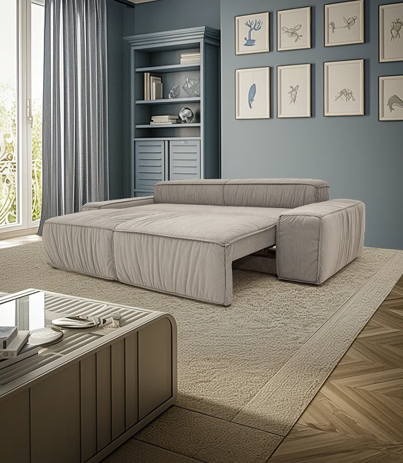 Думала, что он будет выглядеть массивно, но наоборот — благодаря четким линиям и низкой посадке он только добавляет простор. Ткань Шарлотта выглядит дорого, как велюр, но не затирается. Цвет взяла универсальный, подходит и к светлым шторам, и к темному полу. Механизм разложения работает четко, без скрипов. Спать на нем очень удобно, ровная поверхность, ничего не «гуляет». Единственное, доставляли чуть-чуть дольше, чем обещали (обещали 5 дней, привезли за 8), но зато все без повреждений и с подъемом. Супер вариант если хотите стильно, удобно и не громоздко даже в небольшой комнате.