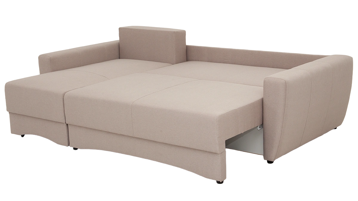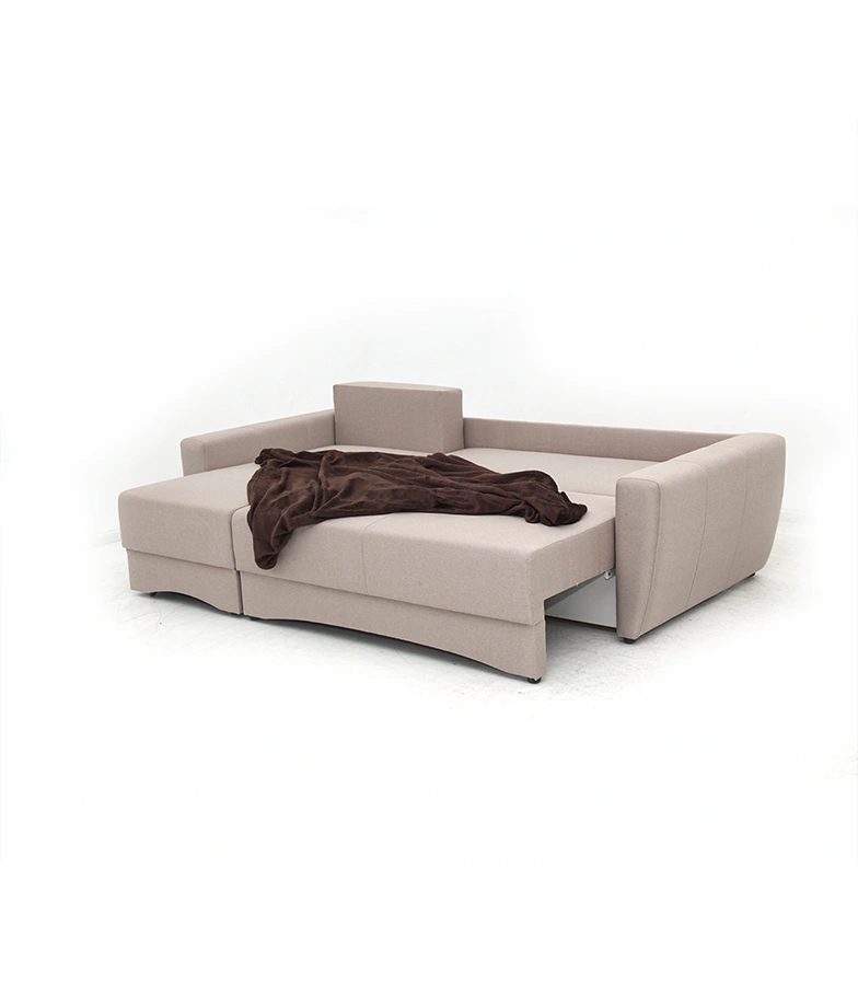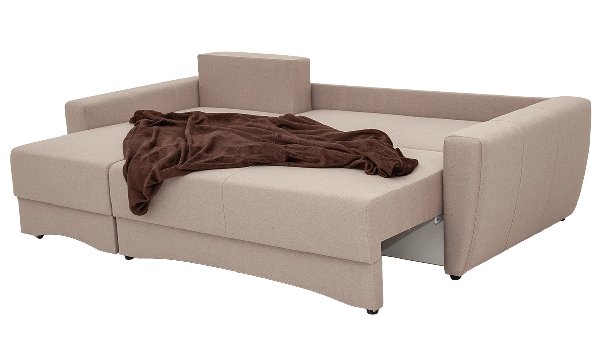 Коли гості залишаються на ніч, розкладати ліжко — квест. Тут механізм «крокуча єврокнижка» (пантограф) висувається м’яко вперед і не дряпає підлогу, тож перехід у режим сну займає лічені секунди. Висота посадки близько 45 см зручна і дорослим, і дітям, а спальне місце формату орієнтовно 150×200 см дає повноцінний сон без «перекатів».