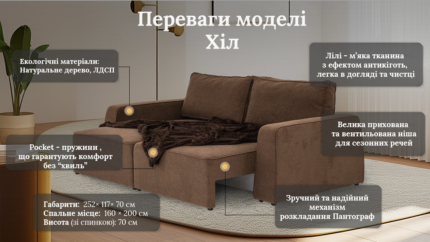 Диван Хіл — ідеальне рішення для тих, хто шукає не просто меблі, а затишок та функціональність у кожній деталі. Вишуканий теплий коричневий колір додає характеру інтер’єру, а класичний дизайн дозволяє гармонійно вписати диван у вітальню, спальню або навіть заміський будинок.