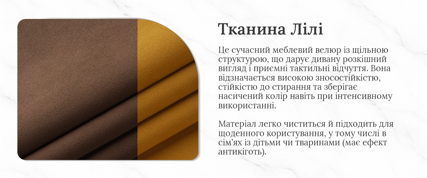 Сам диван класний прям такий стильний та м’якенький. Велюр приємний, хоча трохи на ньому остаєця пилюка — то треба чистить частіше. Подушки точ в точ як на фото яскраві та теж мякі.
