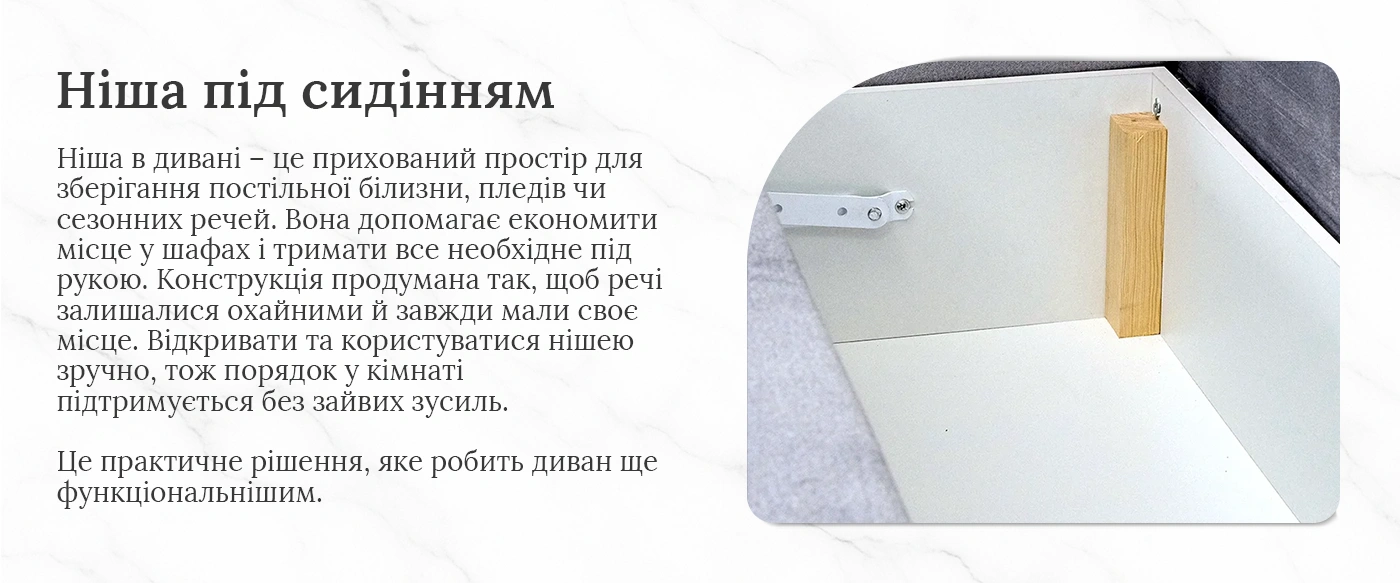 Диван прийшов як на фото, колір трохи світліший ніж я думав, але виглядає гарно, дорого. Сидіти удобно, не провалюєшся, пінка тримає форму. Механізм пантограф простий, нічого складного, але в перший раз сам не розібрався — добре що в інеті є відео)) Розміри дійсно великі, якраз на нашу кімнату. Ніша велика, постіль влізла спокійно. Мінус — доставка довга, затрималась на 6 днів і треба було самому писати. Але диван свої гроші оправдує.
