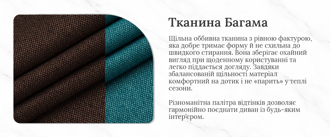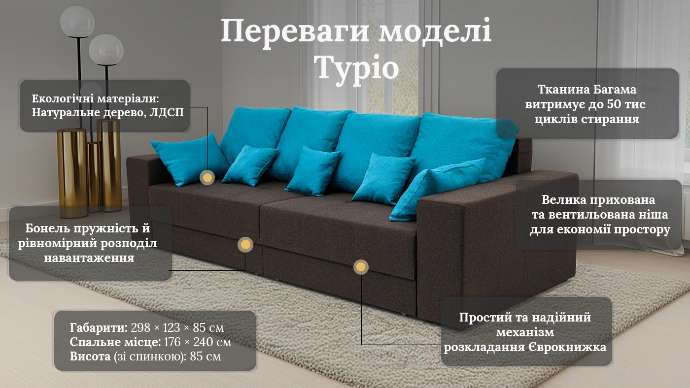 Прямий диван Туріо — це поєднання глибоких фактур, надійної конструкції та несподіваного кольорового акценту. Жаккард Bahama 11 із темно-шоколадною основою створює атмосферу спокою, а бірюзові подушки додають легкості та характеру. Такий контраст освіжає інтер’єр і робить диван самодостатнім стилістичним центром кімнати.