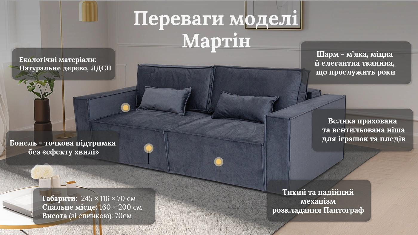 Диван Мартін — ідеальне рішення для тих, хто цінує комфорт, функціональність і стриманий стиль. Темний сірий колір моделі надає інтер’єру вишуканості та глибини, а завдяки продуманим деталям ця модель стане справжнім центром затишку у вашій вітальні чи спальні.