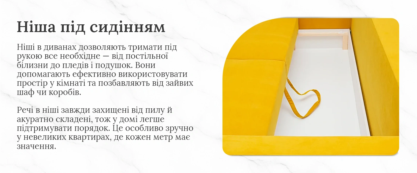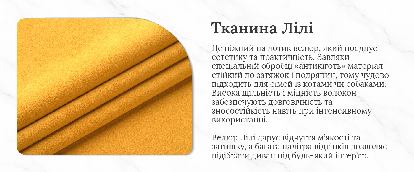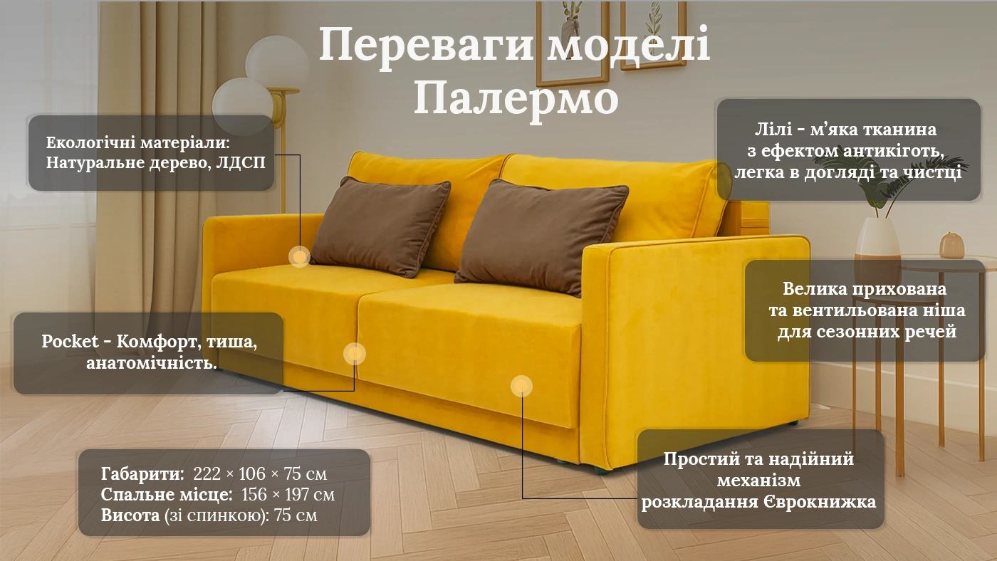 Диван Палермо просто 🔥🔥! Жовтий велюр виглядає яскраво, але не кричущо, в кімнаті стало так тепло від кольору) Але довелося уточнювати колір з менеджером 2 рази (інфо на сайті трохи збивала). Механізм єврокнижка працює плавно, навіть дитина справляється. Білизняна ніша величезна – усе пледи, подушки сховала. Доставка вчасна, але кур’єр довго шукав наш підїзд, то це трошки нервувало)) Але загалом супер, рекомендую!