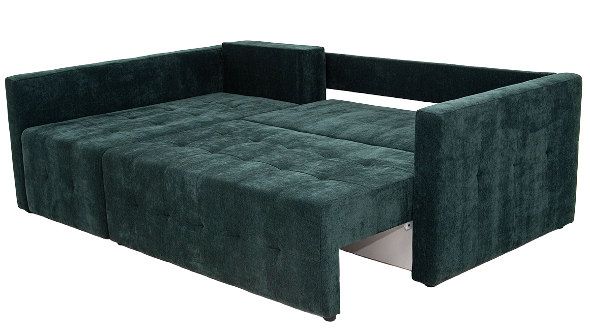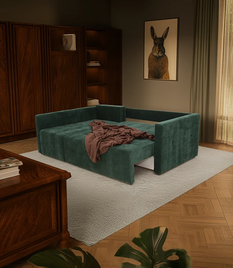 Коли хочеться сну, крокуюча єврокнижка “Пантограф” м’яко висувається вперед, не дряпаючи підлогу і не вимагаючи сили. Спальне місце рівне й підтримувальне — 2000×1300 мм, з можливістю конфігурації до 2000×2200 для більшого простору. Пружинний блок у парі з шарами ППУ працює як матрац: тримає спину, не провалюється й не “грає” по краях. Прокидаєшся з відчуттям ліжка, а не компромісу.