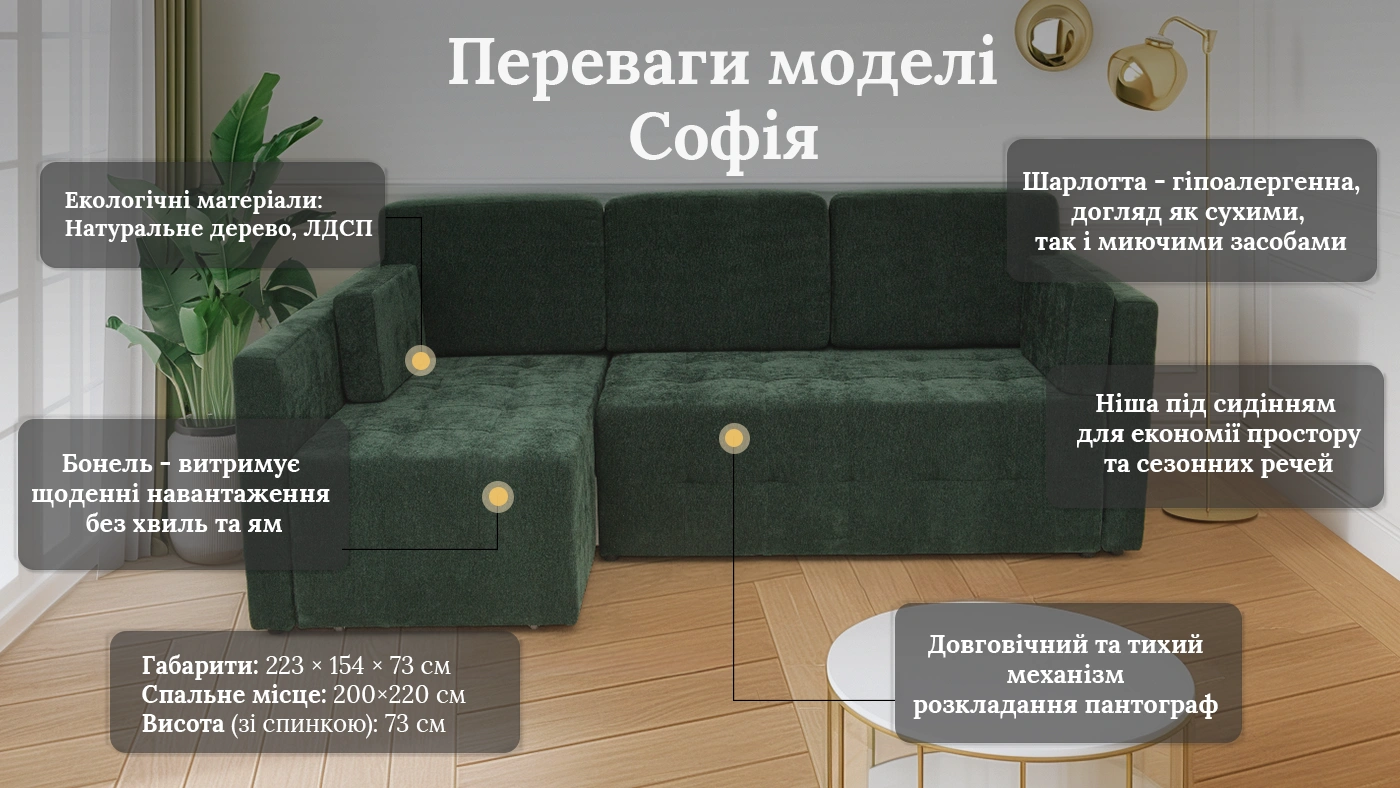 Софія кут — диван, що одразу задає порядок у просторі. Вивірені лінії, лаконічні підлокітники та глибока Г-посадка створюють затишний центр кімнати. Габарити 2230×1540 мм дарують відчуття масштабу без громіздкості, висота 730 мм (приблизно 920 мм із подушками) тримає правильні пропорції, а посадка 450 мм дозволяє легко підводитись. Тканина “Шарлотта 38” додає стриманого шику й органічно поєднується зі світлими стінами, деревом та металом.
