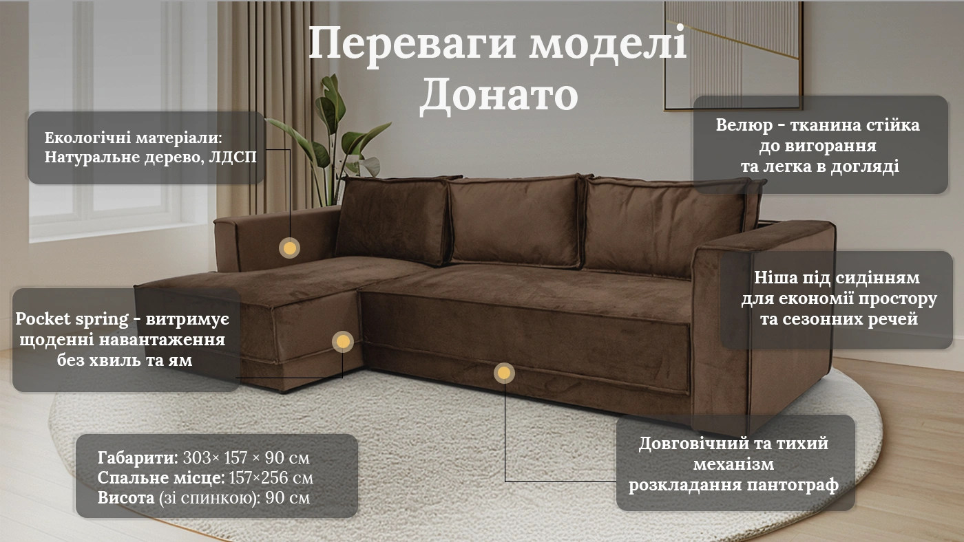 Коричневий Донато — диван кутовий, що поєднує затишок велюру Sharm 15 із місткою «спальною зоною» 157 × 256 см. Лівий кут економить простір, а каркас і основа з натурального дерева не бояться щоденних перевантажень.