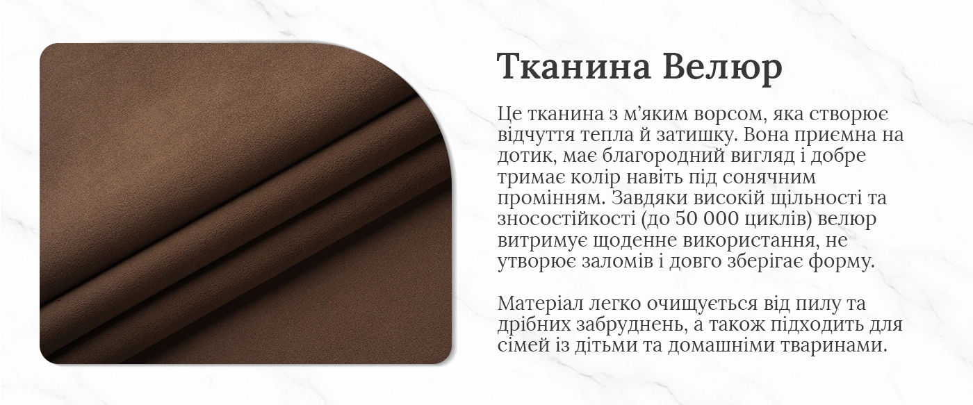 Диван обрав через класний вигляд і шо він з велюру (дружина дуже хотіла) – реально приємний на дотик! Вживу виглядає навіть краще ніж на фотках, сидіти м’якенько, а як розкладаєця – місця валом. Спимо з дружиною вже 2 тижня, поки шо без нарікань. єдине що доставка трохи підвела, замість 10 днів вийшло 14. Але це того вартувало. Диван величезнй та сам по собі шикарний. Рекомендую.